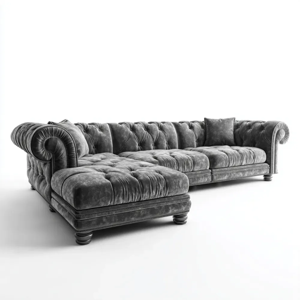 ProduitCe canapé d'angle en velours offre une touche d'élégance avec son design classique, parfait pour sublimer tout espace de vie avec du confort et du style.